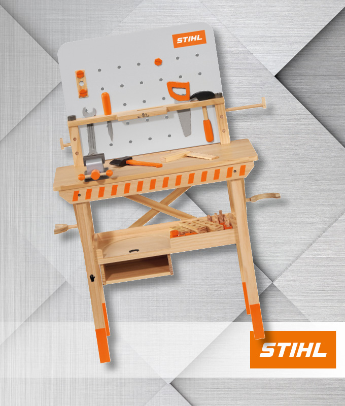 Spielerisch handwerklich aktiv werden: Die robuste, FSC-zertifizierte Kinderwerkbank von STIHL aus Kiefernholz bietet viel Platz für kleine Projekte und fördert Kreativität und Geschick. Mit detailreichem Design und passenden STIHL Holzwerkzeugen – für echten Spielspass wie bei den Grossen.